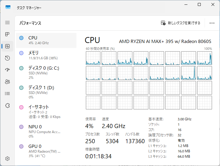 CPUはAMD Ryzen AI Max+ 395で16コア32スレッドです。