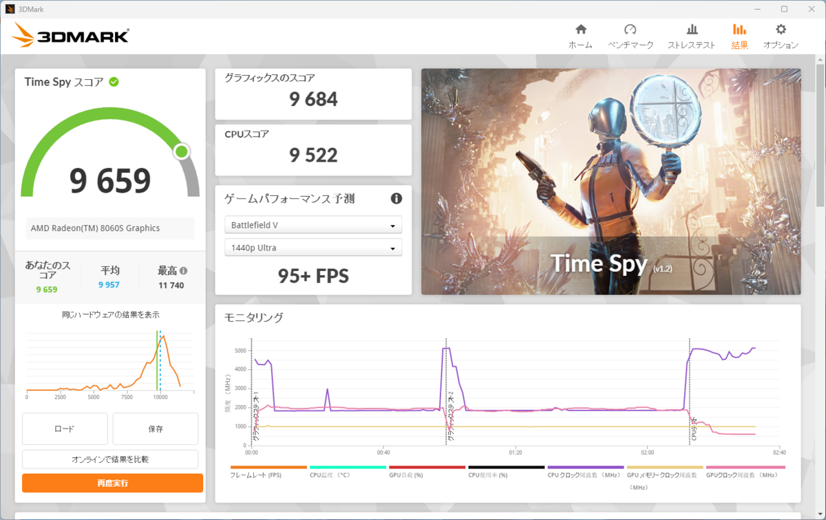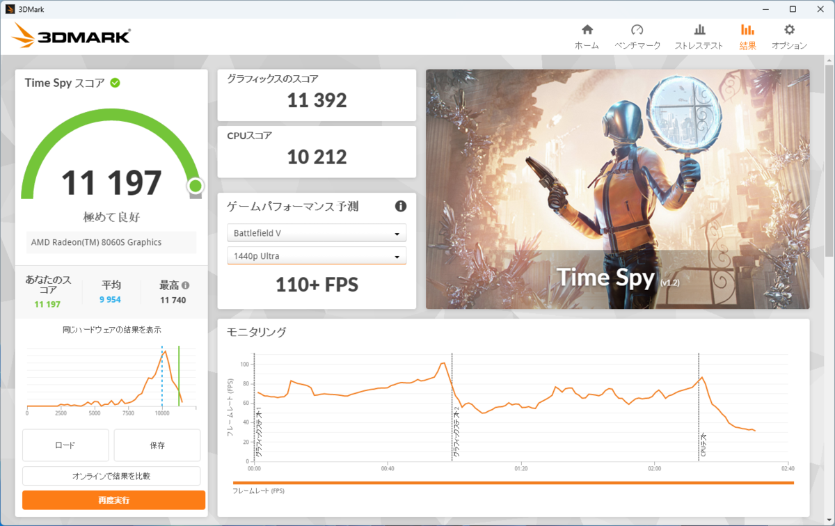 性能も目安として3DMarkのTime Spyを実際に実行してみました。