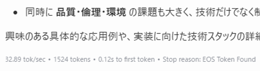 プロンプトに「生成AIって何?」と入力した結果ですが、32.89token/s出ました。